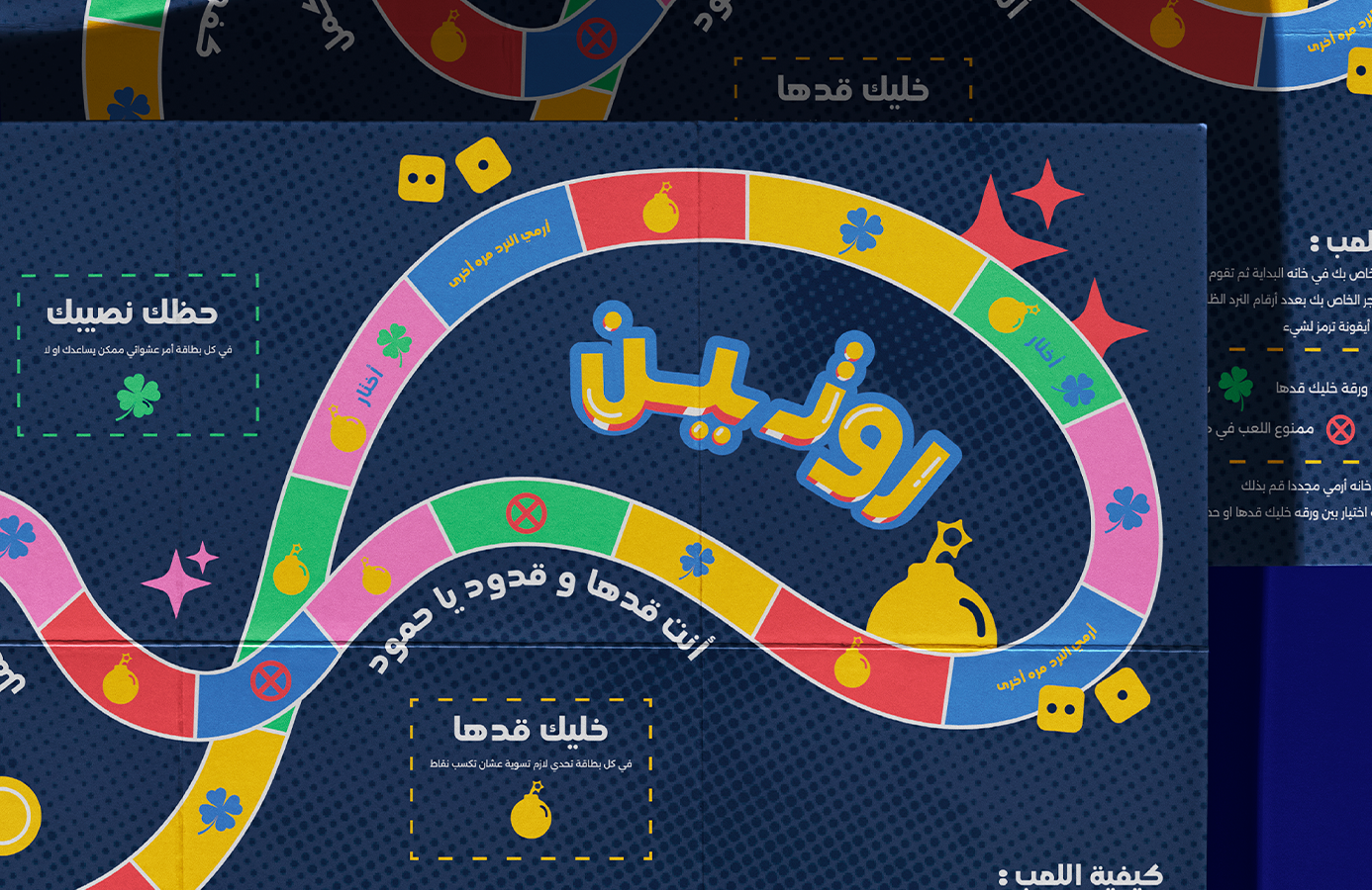 A board game was designed to break the routine in a fun way without the players noticing, reflecting both modernity and enjoyment. The target group is collectors’ cups for ages 13-17. For the design, I created a simple style that would attract this demographic. I used bold colors with a dark background to make the design stand out, and incorporated texture to enhance its aesthetic appeal. Instructions were placed on the side to make it easier for players to understand the rules. I also included designated spots for the cards, along with simple explanations for each one. The game doesn’t have a fixed end; players can continue until they run out of cards or choose to stop.